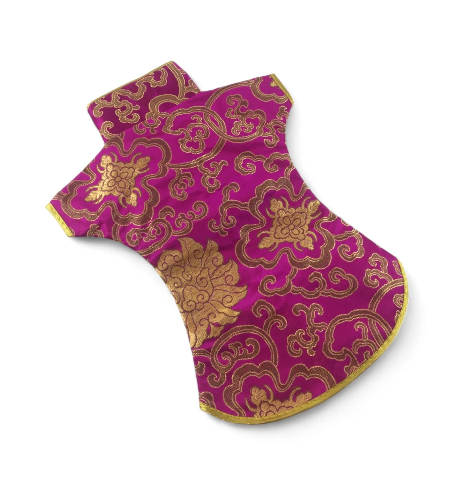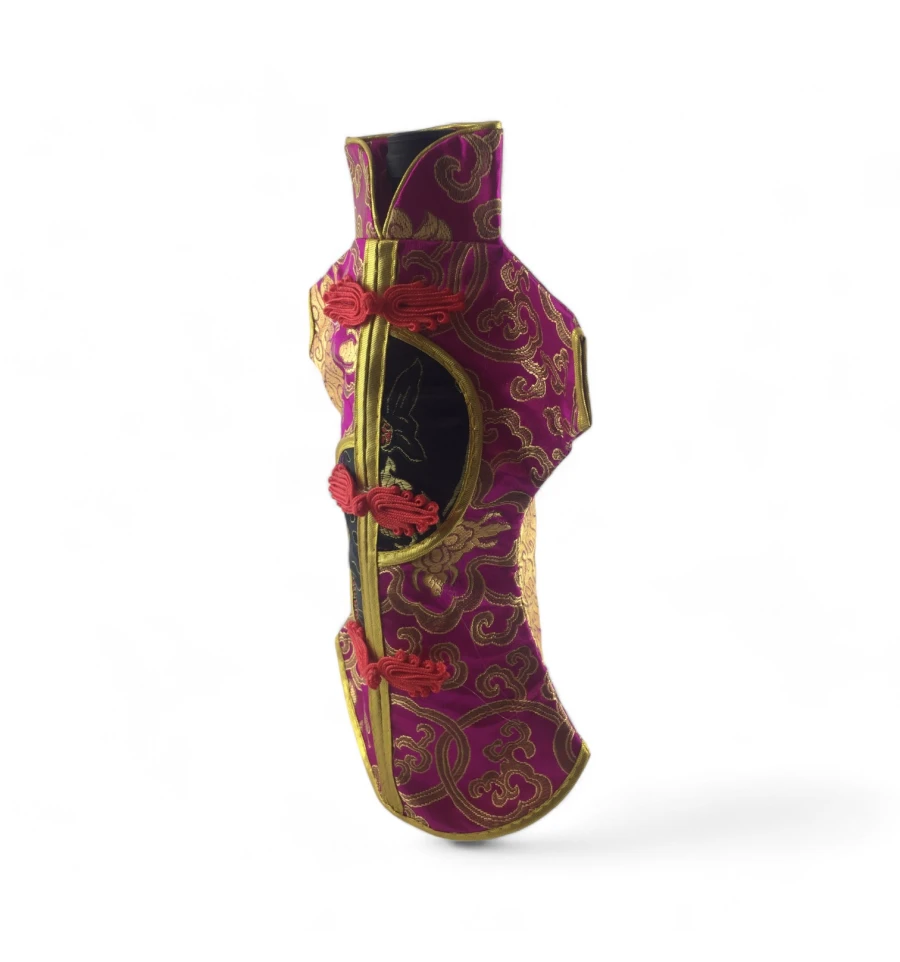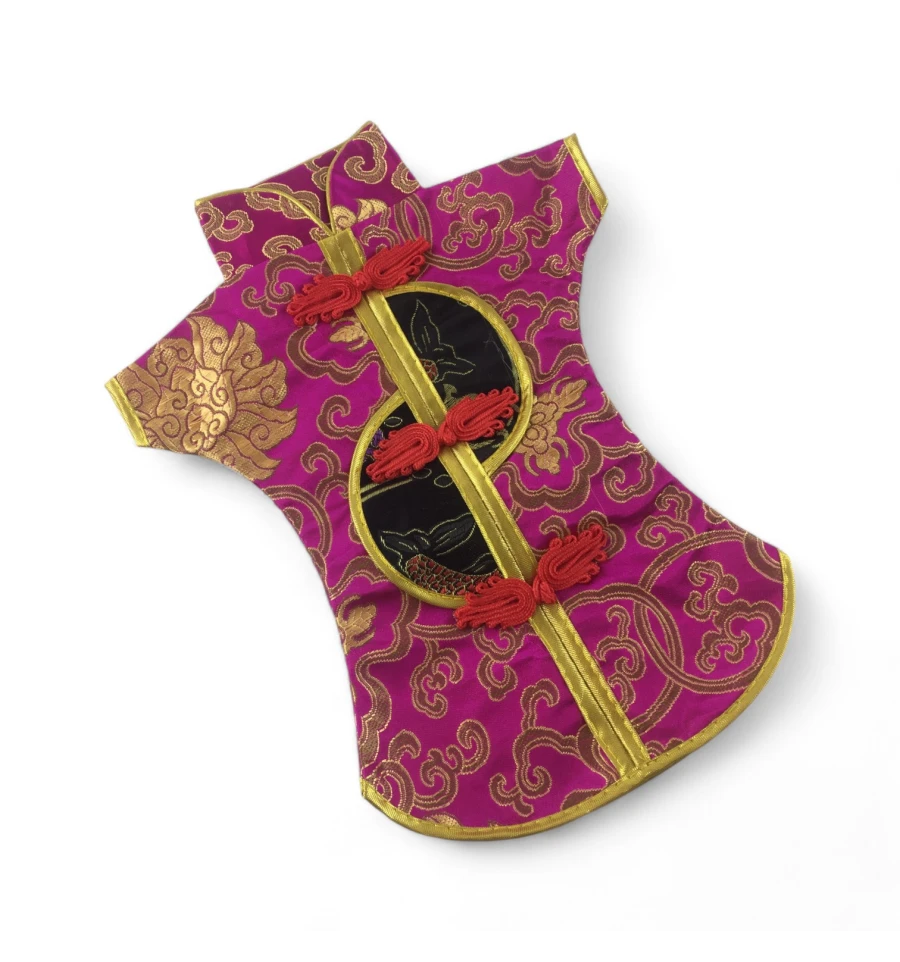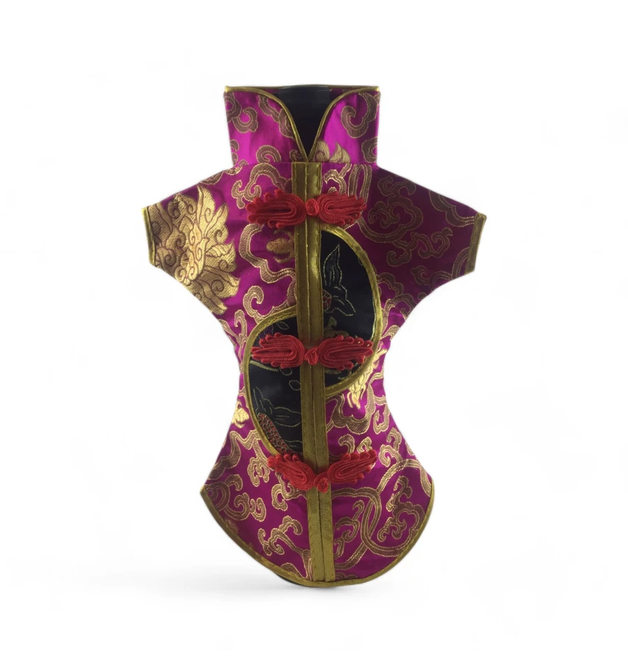 Цей елегантний чохол на пляшку виконаний у традиційному східному стилі та нагадує мініатюрне кімоно. Він виготовлений із міцної тканини з яскравим орнаментом, що включає символи та зображення, типові для східної культури.