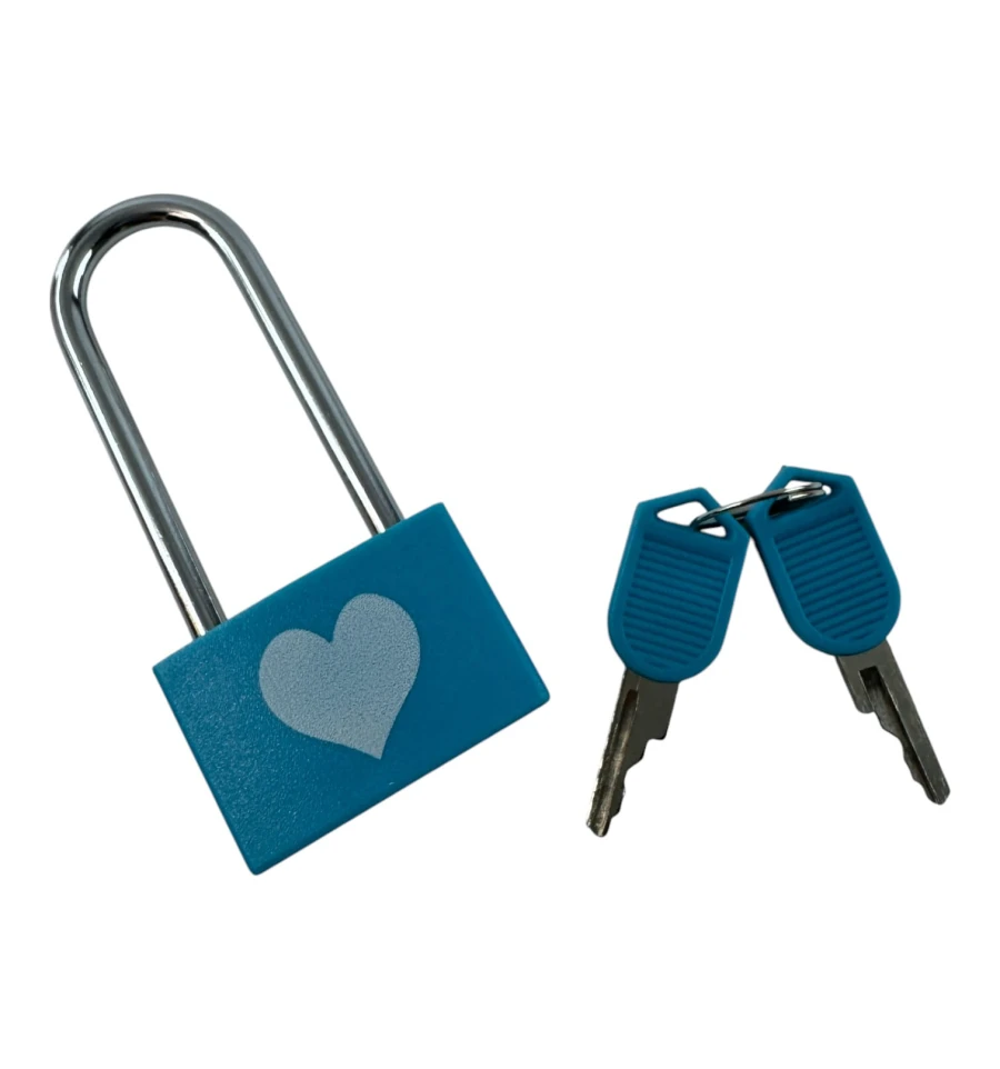 Цей замок для закоханих – символ міцного зв'язку та вічного кохання. Він виконаний у яскравому рожевому кольорі з витонченим білим серцем у центрі, що підкреслює його романтичний характер. У комплекті йдуть два ключики, дозволяючи парі разом замкнути свої почуття у цьому символі відданості. Замочок ідеально підходить для закріплення на мостах кохання, на пам'ятних місцях або для використання як подарунок, який уособлює непорушний зв'язок між двома серцями.