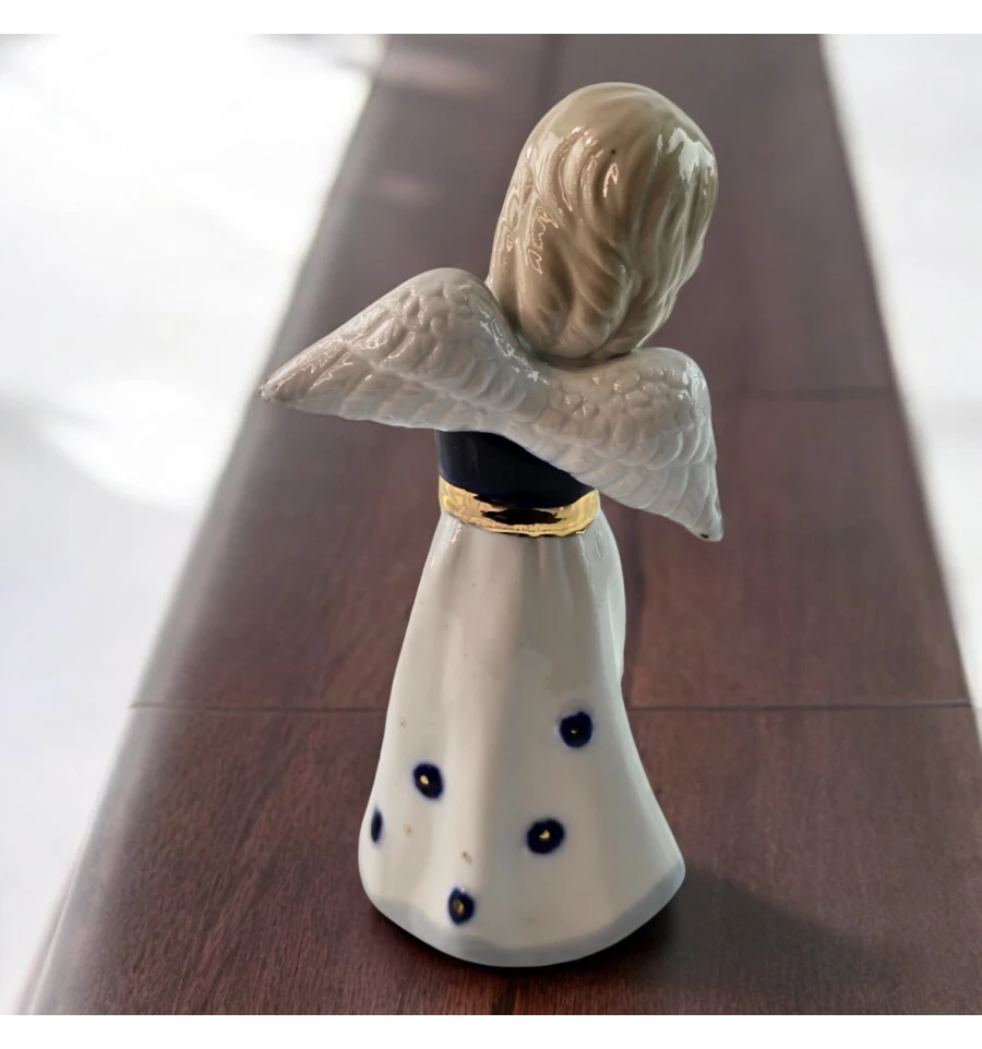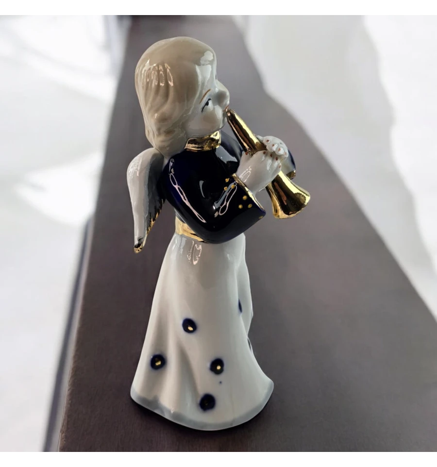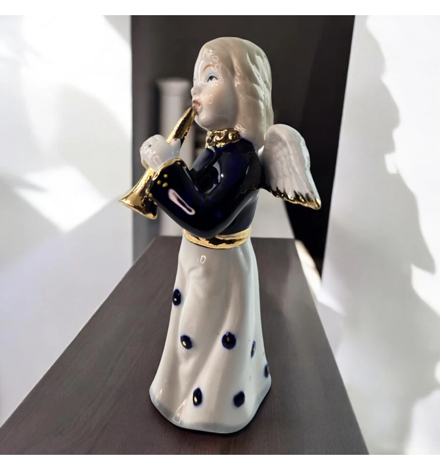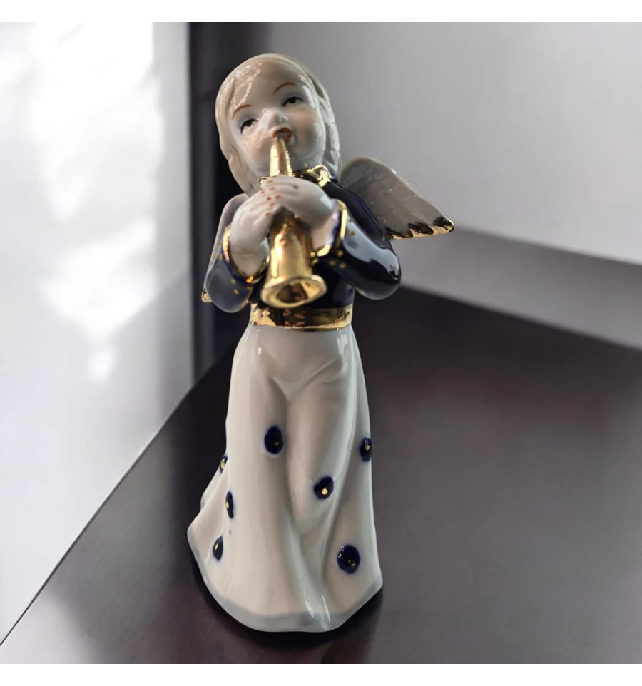 Ця чарівна фігурка ангела з трубою створить атмосферу затишку та спокою у вашому будинку. Витончений дизайн, ніжні риси обличчя та золотиста труба надають ангелові особливого шарму. Його біла сукня прикрашена темно-синіми декоративними елементами, а деталізовані крила додають витонченості. Ідеальний вибір для прикраси інтер'єру або як подарунок на будь-яке свято.