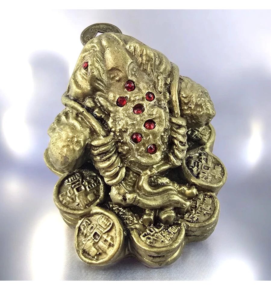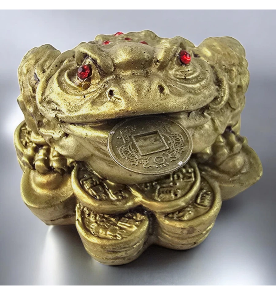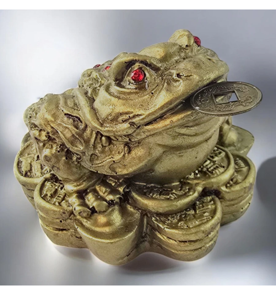 Ця статуетка золотистої триногої жаби з монеткою в роті - потужний символ успіху та багатства в китайському Фен-Шуй. Вона виготовлена з полімеру та виготовлена в Китаї. Висота статуетки становить 5,1 см, ширина - 7,5 см, глибина - 6,5 см, а діаметр монетки - 1,5 см. Вважається, що така жаба приносить фінансову удачу та сприяє зростанню добробуту.