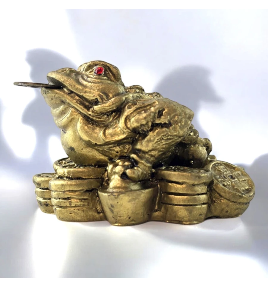 Золота жаба з монеткою є талісманом, який приваблює грошову енергію, покращує матеріальне становище та допомагає захистити будинок від фінансових втрат. Її купують, щоб посилити фінансові потоки, залучити нові можливості та стабілізувати грошові доходи. Жаба, що сидить на стопці монет, символізує процвітання та достаток.