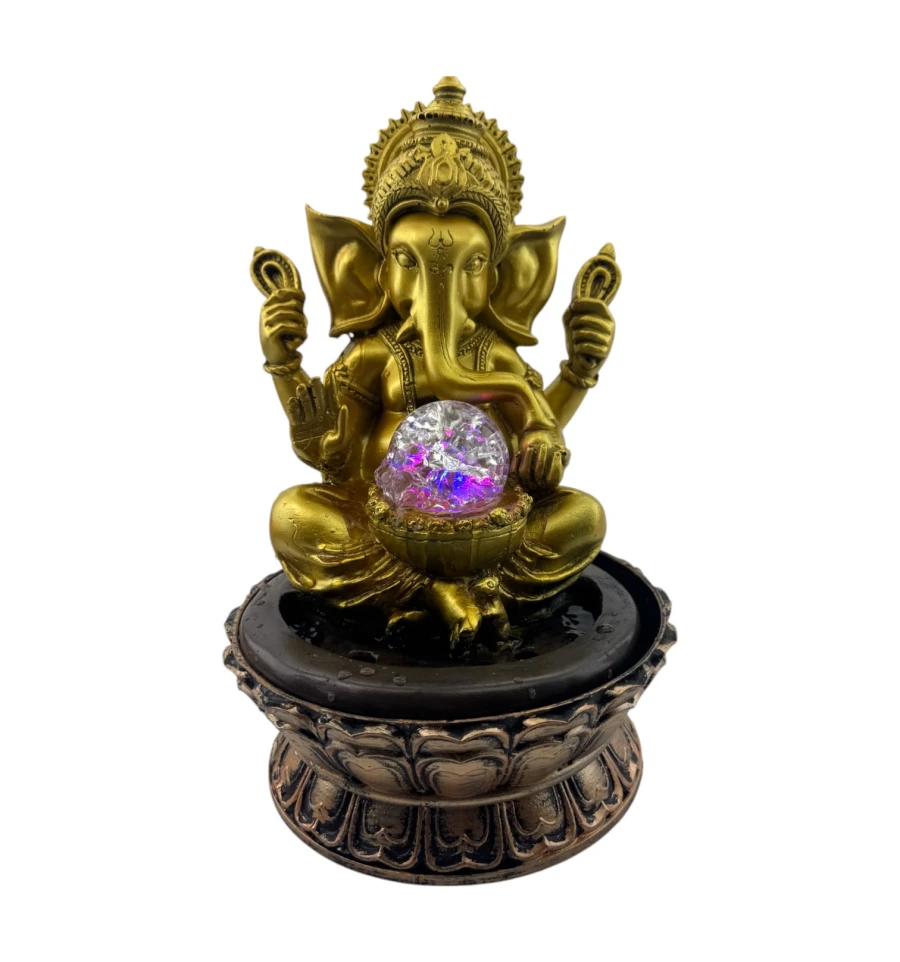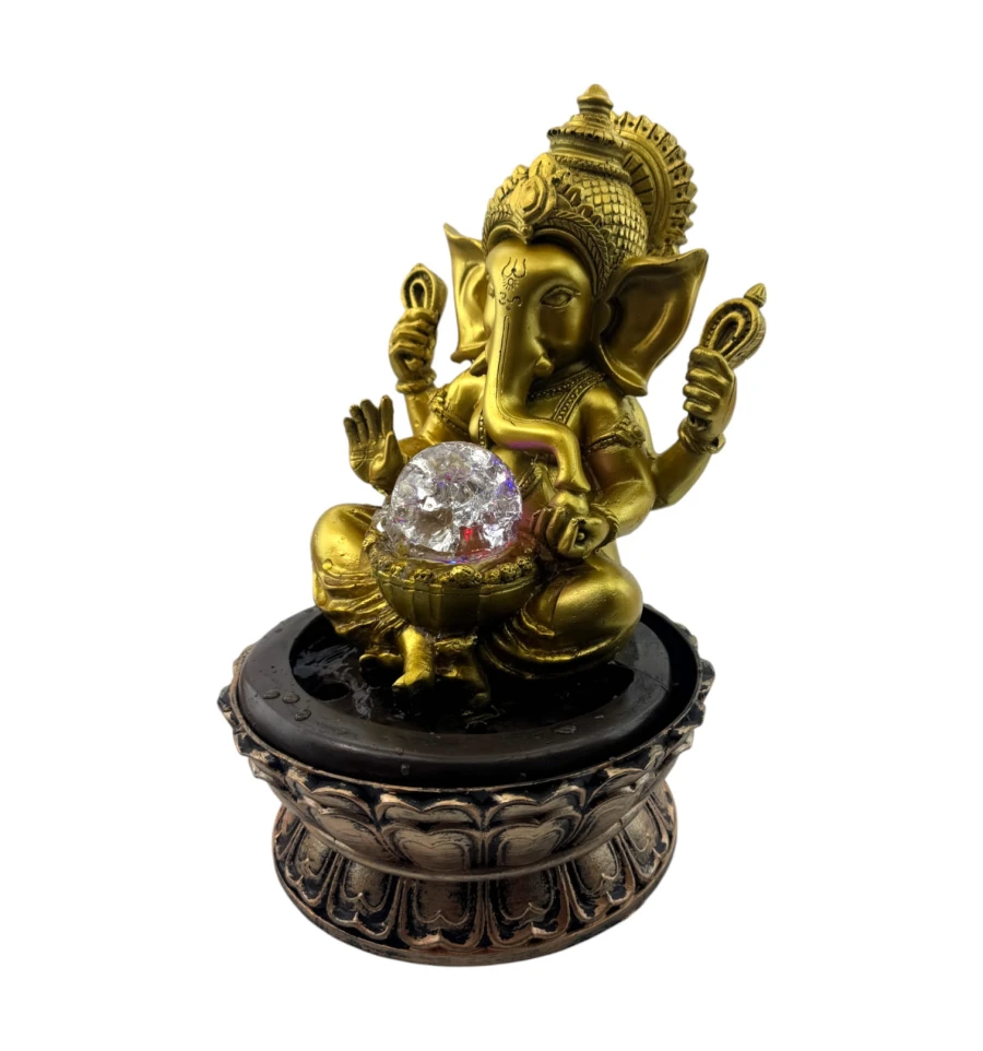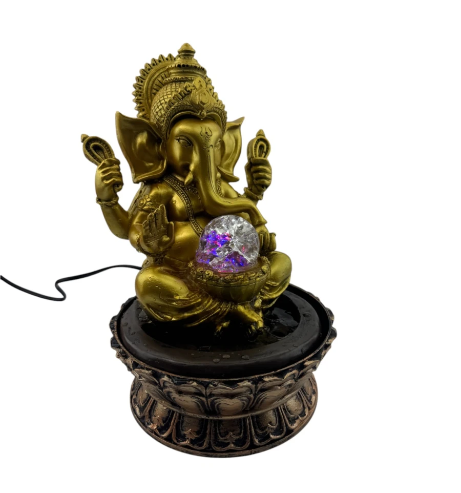 Ця елегантна статуетка Ганеш, інтегрована у фонтан, стане справжньою окрасою будь-якого інтер'єру. Виконана з міцного полімеру, вона поєднує духовну символіку і сучасний дизайн. Ганеша, зображений у традиційній позі, тримає містичну сферу, яка підсвічується різнобарвними LED-вогнями, створюючи атмосферу затишку та спокою.