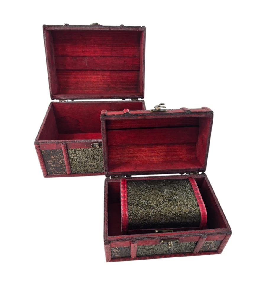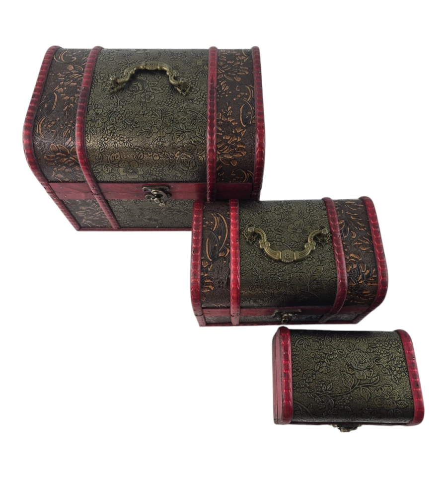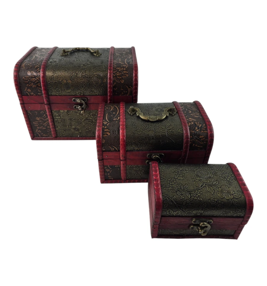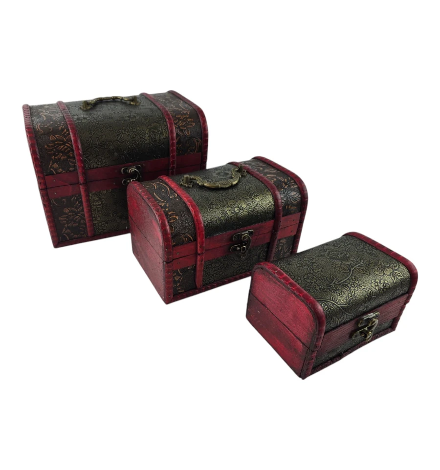 Набір із трьох скриньок "Тріада Тайн" - це не тільки чудовий елемент декору, а й практичне рішення для зберігання ваших скарбів. Кожна скринька виконана з дерева з майстерним декоративним оздобленням, яка надає виробу вінтажного та вишуканого вигляду. Візерунковий малюнок і глибокий червоний відтінок створюють атмосферу таємниці та розкоші. Скриньки ідеально підходять для зберігання прикрас, листів, пам'ятних сувенірів та інших дорогих серцю речей. Цей набір додасть нотку витонченості вашому інтер'єру та підкреслить ваш смак.