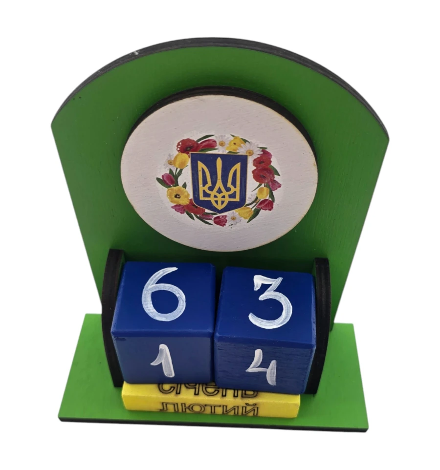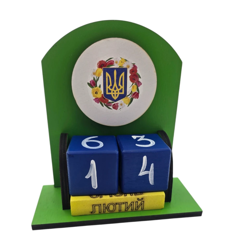 Пропонуємо вам вічний календар у зеленому кольорі в українському стилі "Квітуча Україна". Розписаний вручну на білому тлі, цей календар є чудовою прикрасою для вашого будинку чи офісу. Кубики місяців у жовтому кольорі, а чисел, у синьому, виконані вручну і мають розміри 40х40х40 мм та 80х14х14 мм відповідно. Розмір всього календаря складає 155х142х60 мм.