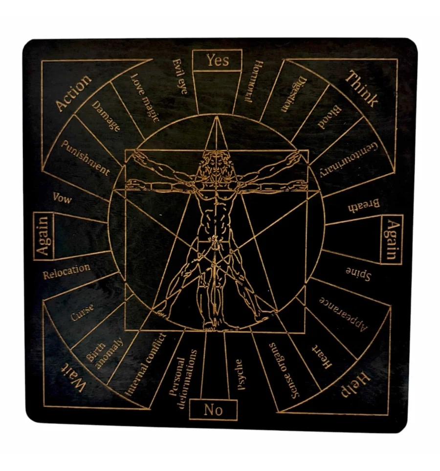 Ця таблиця призначена для роботи з маятником і допоможе вам у магічних практиках та ритуалах. Таблиця виконана в темних тонах і має розміри 26х26х0,8 см. Вона покрита емаллю, що забезпечує її довговічність та захищає від пошкоджень.