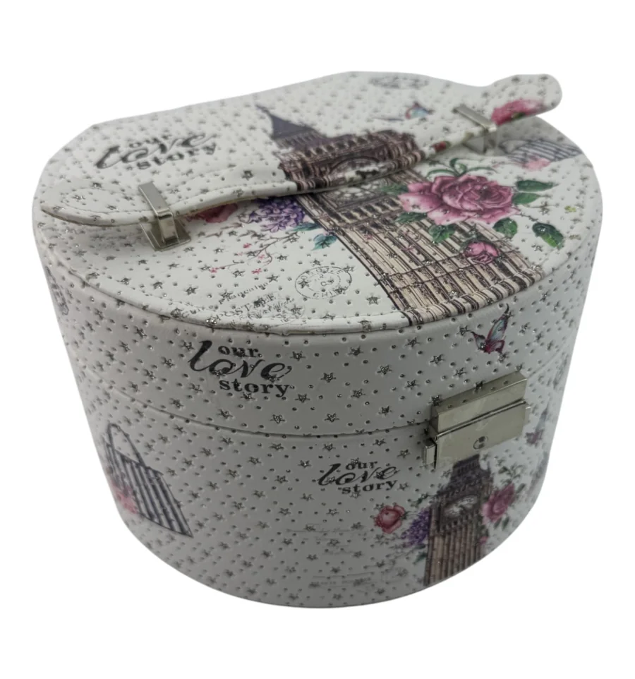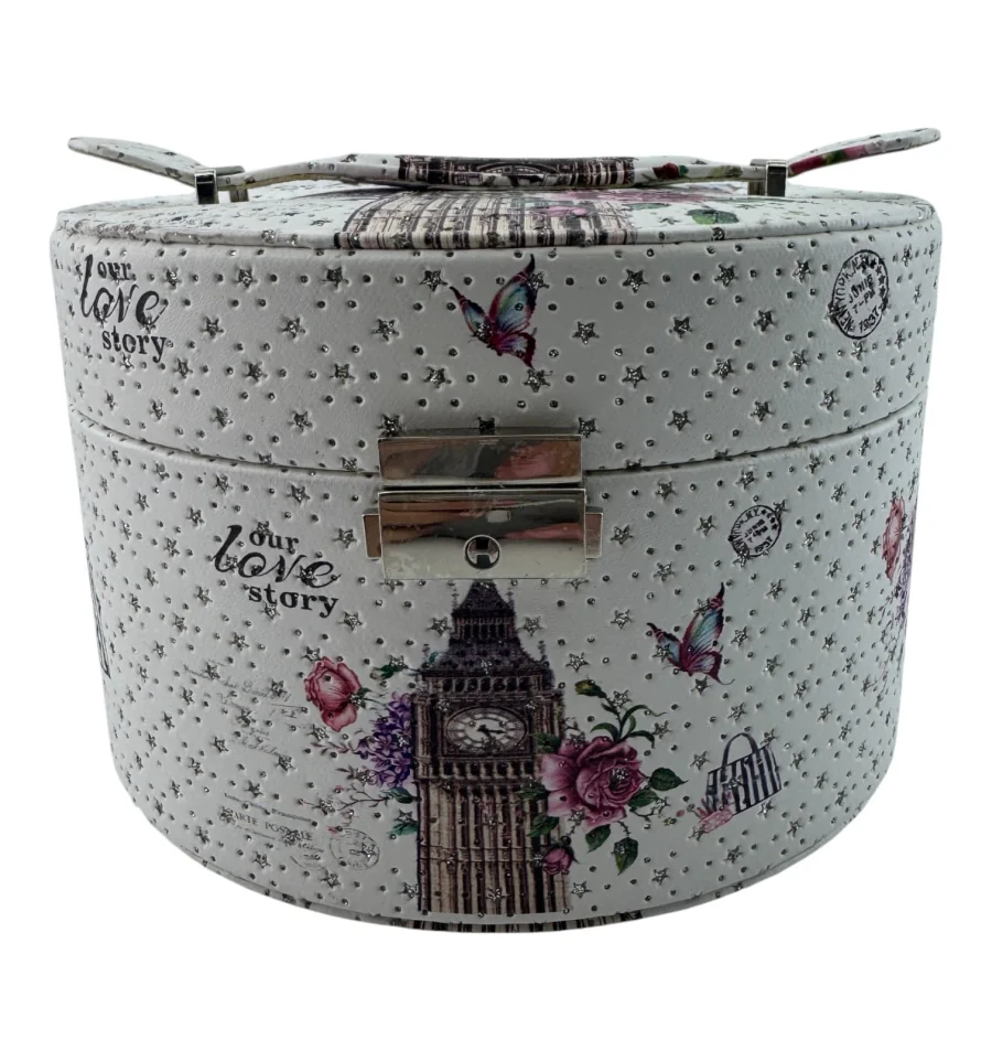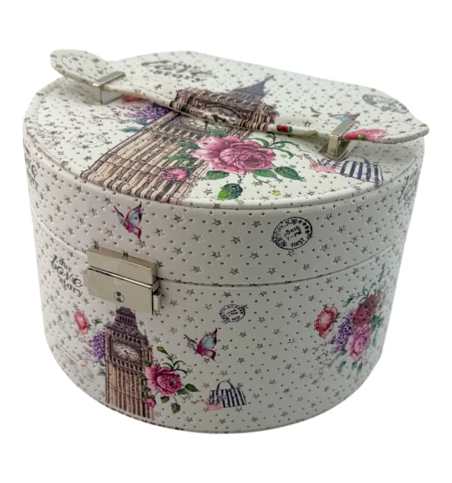 Пориньте в атмосферу старої доброї Англії з цією елегантною скринькою для прикрас. Овальна форма, яскравий принт із символами Лондона, квітами та метеликами надають виробу особливого шарму. Зручний замочок не тільки завершує образ, а й надійно зберігає ваші прикраси.