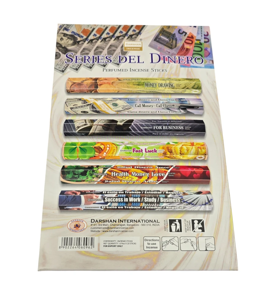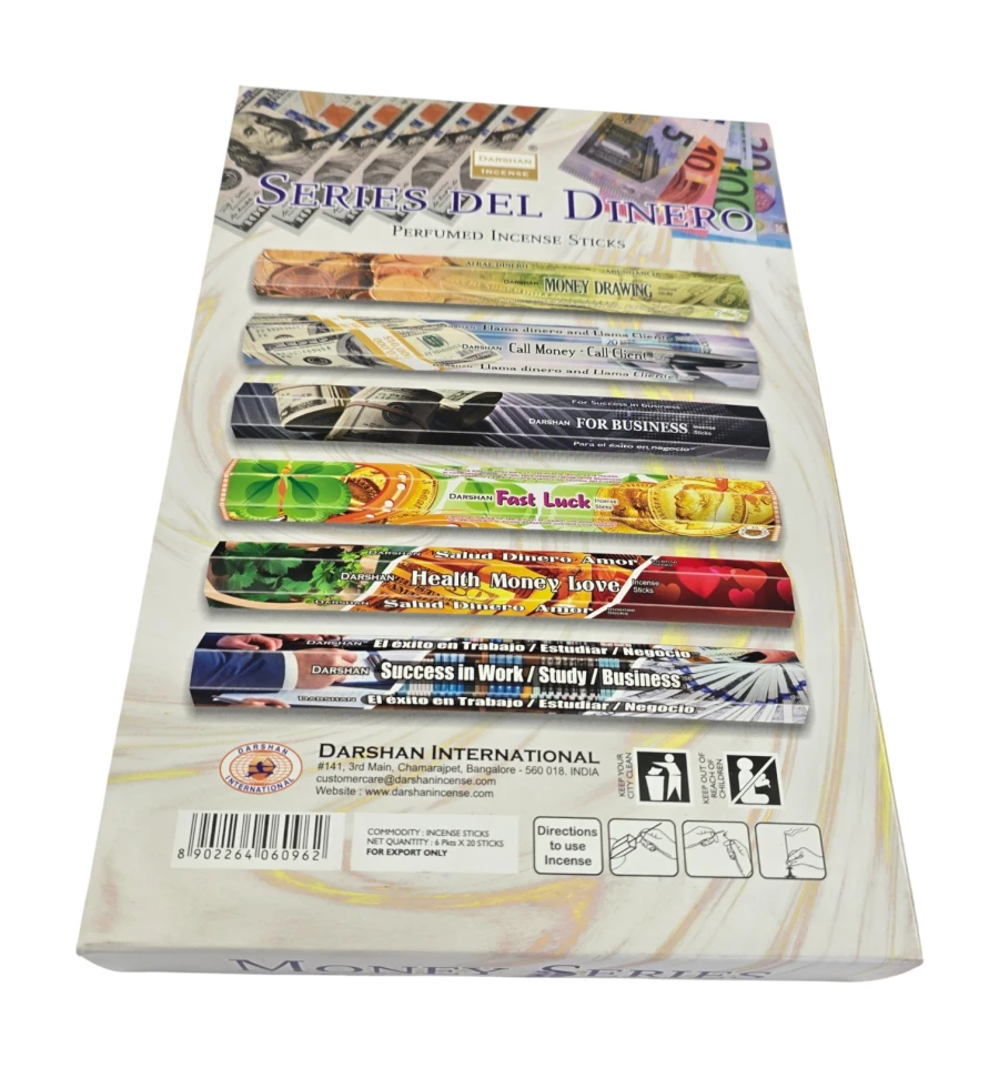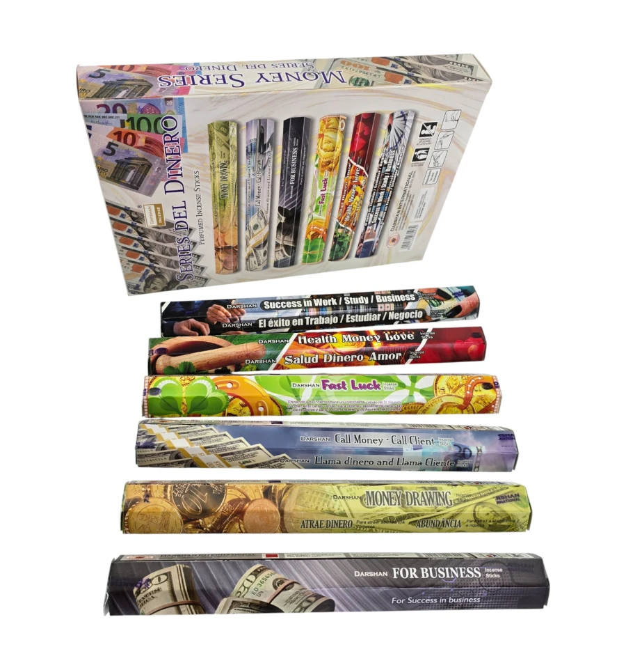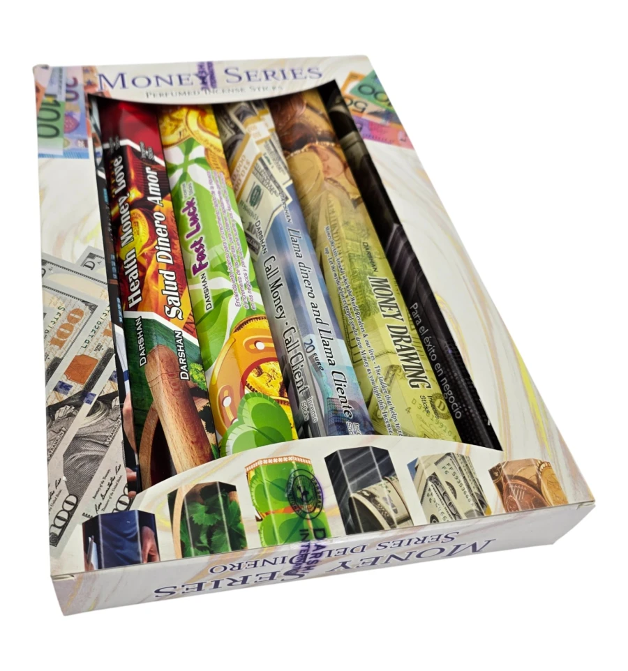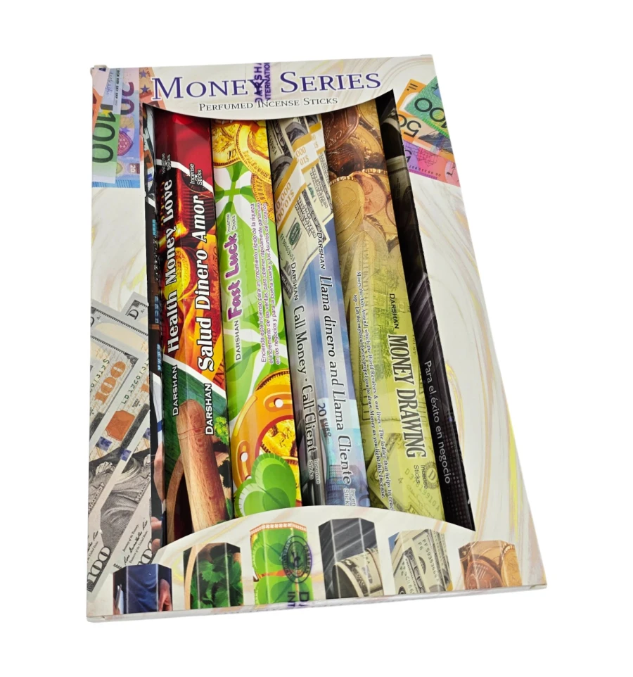 Darshan Money Series – тематичний набір індійських ароматичних паличок для ритуалів на удачу та достаток. У комплекті 6 пачок по 20 паличок з різними напрямками: Money Drawing, Call Money, For Business, Fast Luck, Health Money Love, Success in Work/Study/Business. Палички на бамбуковій основі з ароматичної суміші (масалу/пудра) дають м'який дим і аромат, що поступово розкривається.