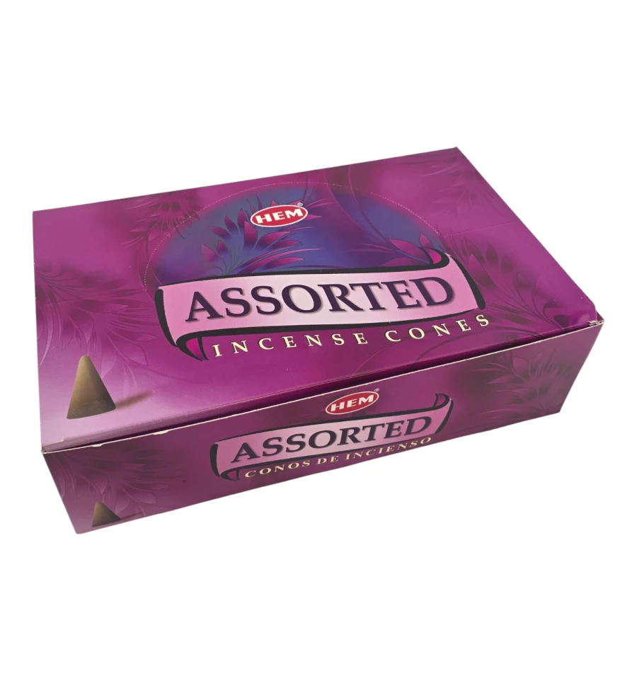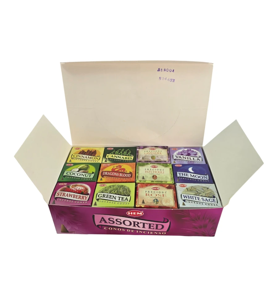Великий набір аромаконусів HEM Assorted для дому, офісу та студії. У коробці 12 різних ароматів, кожного з 4 пачки. У кожній маленькій пачці 10 конусів та металева підставка. Конуси компактні, швидко заповнюють кімнату ароматом і тліють рівно.
