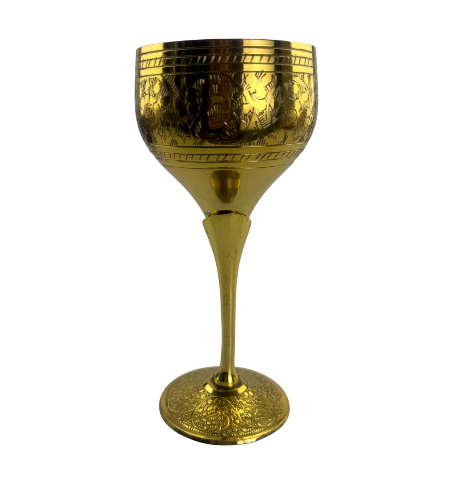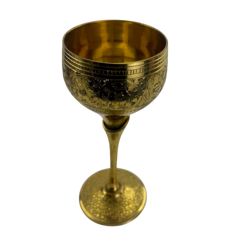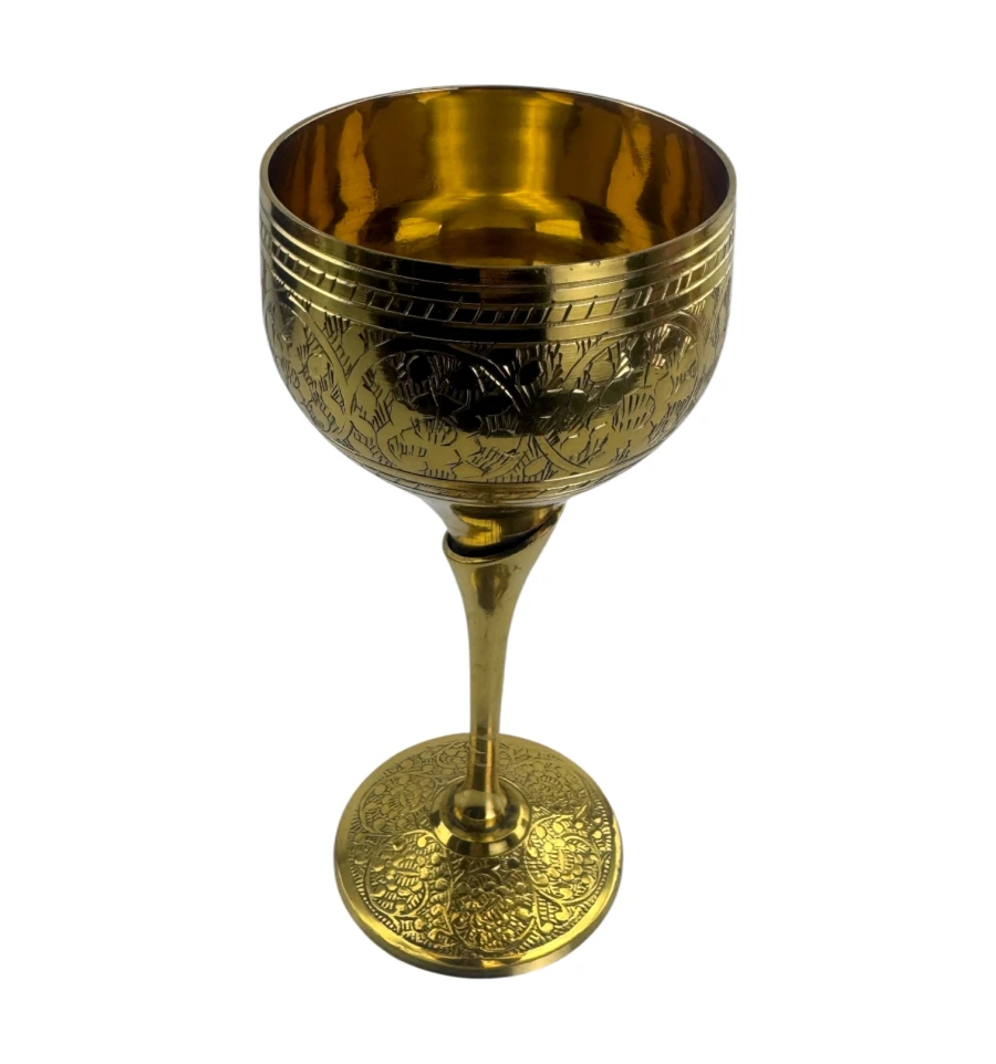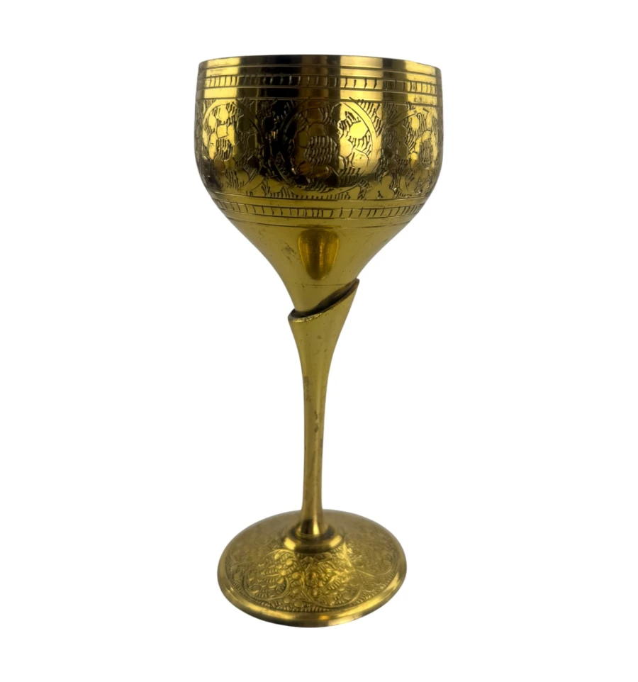 Бронзовий келих із позолоченим покриттям - вишуканий предмет сервірування з виразним металевим блиском. Підходить для напоїв, декоративного використання, фотосесій та тематичних інтер'єрів. Класична форма на стійкій підніжці підкреслює вінтажний та статусний характер виробу.