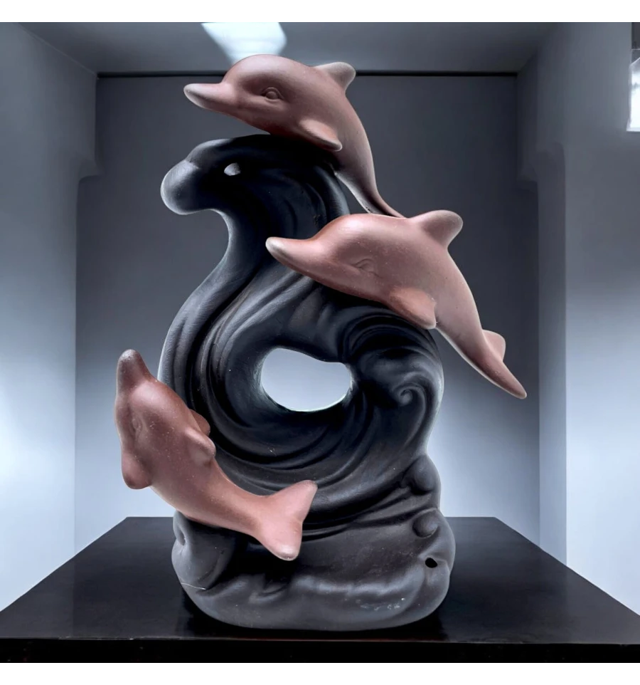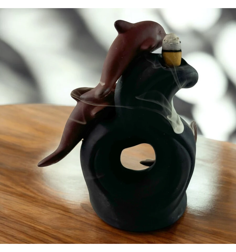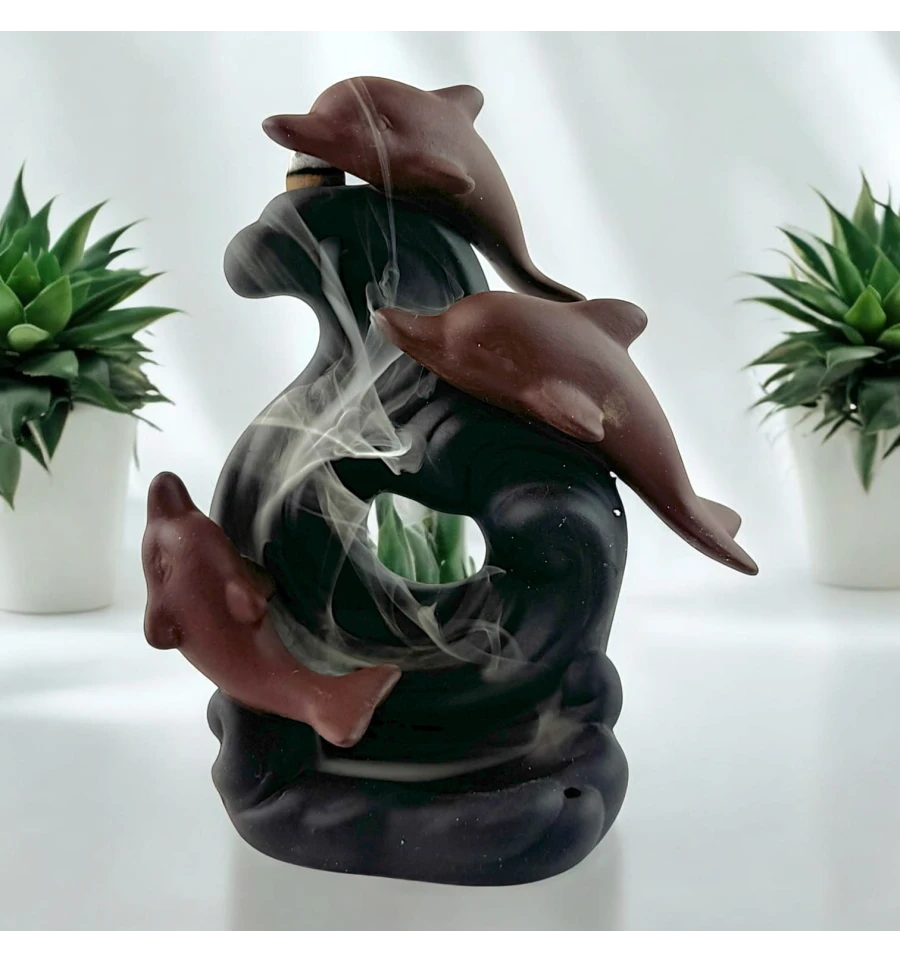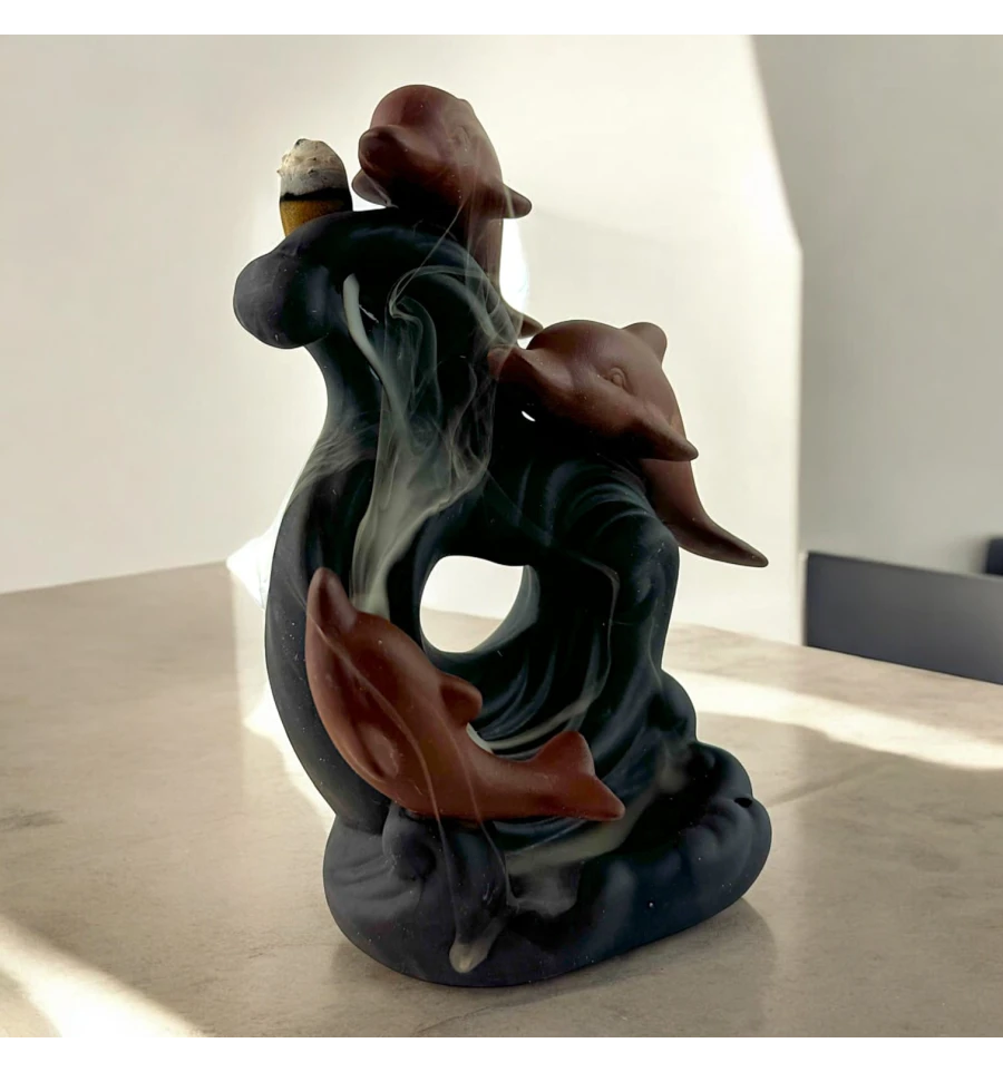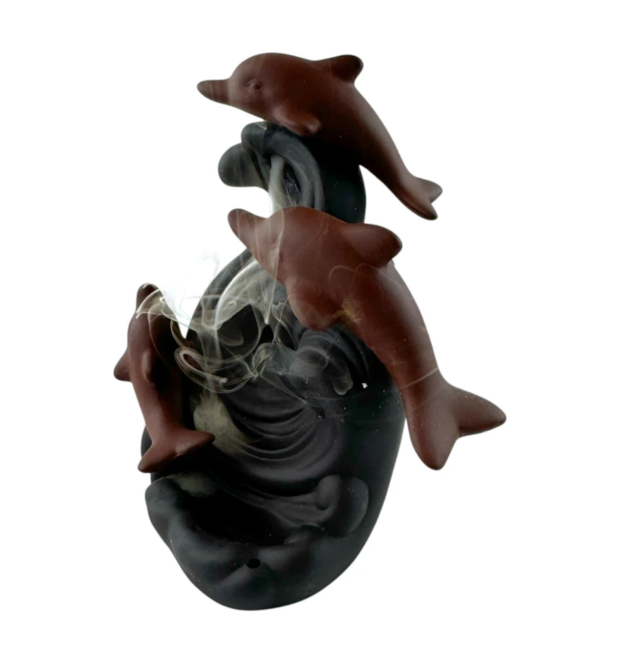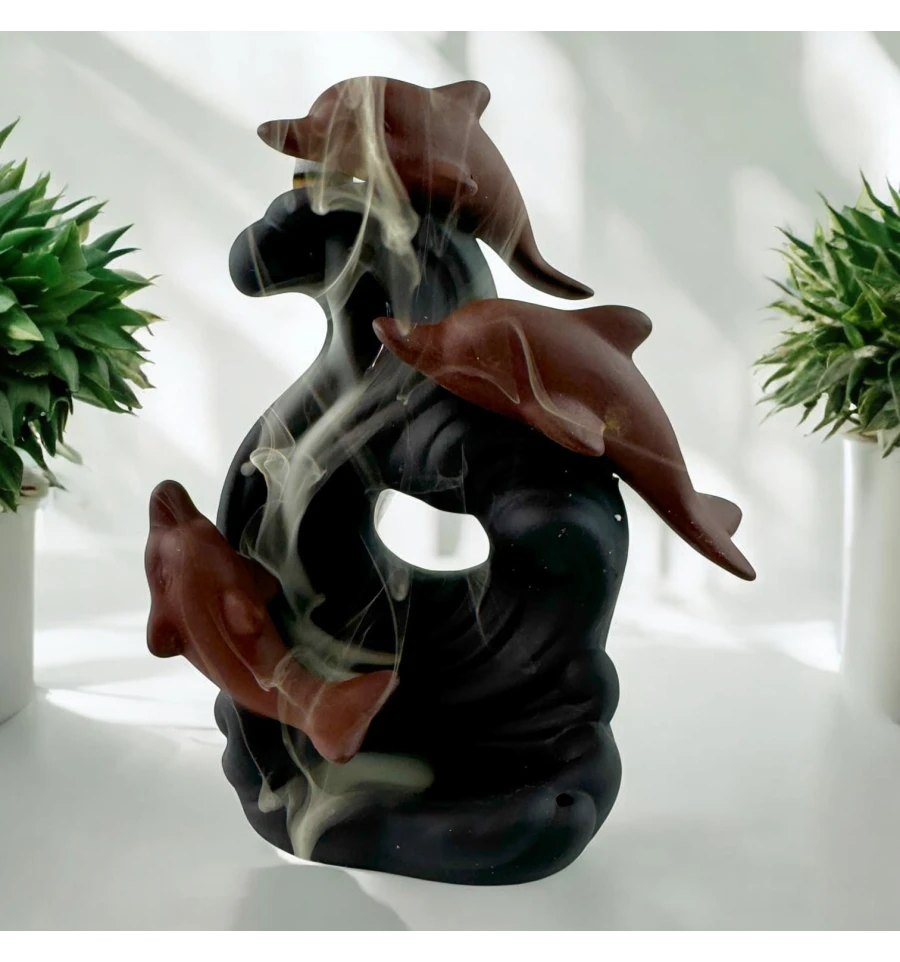 Пориньте у світ морської гармонії з підставкою для пахощів "Морські Дельфіни". Цей витончений аксесуар, виконаний у вигляді трьох дельфінів, що занурюються у хвилю, стане не лише прикрасою вашого інтер'єру, але й створить атмосферу спокою та умиротворення. Коли запалюється пахощі, дим плавно стікає вниз, огортаючи фігури дельфінів, наче вони пливуть у туманних морських глибинах. Насолоджуйтесь магією Back Flow і поринайте в атмосферу справжньої релаксації разом із цією унікальною прикрасою для дому.