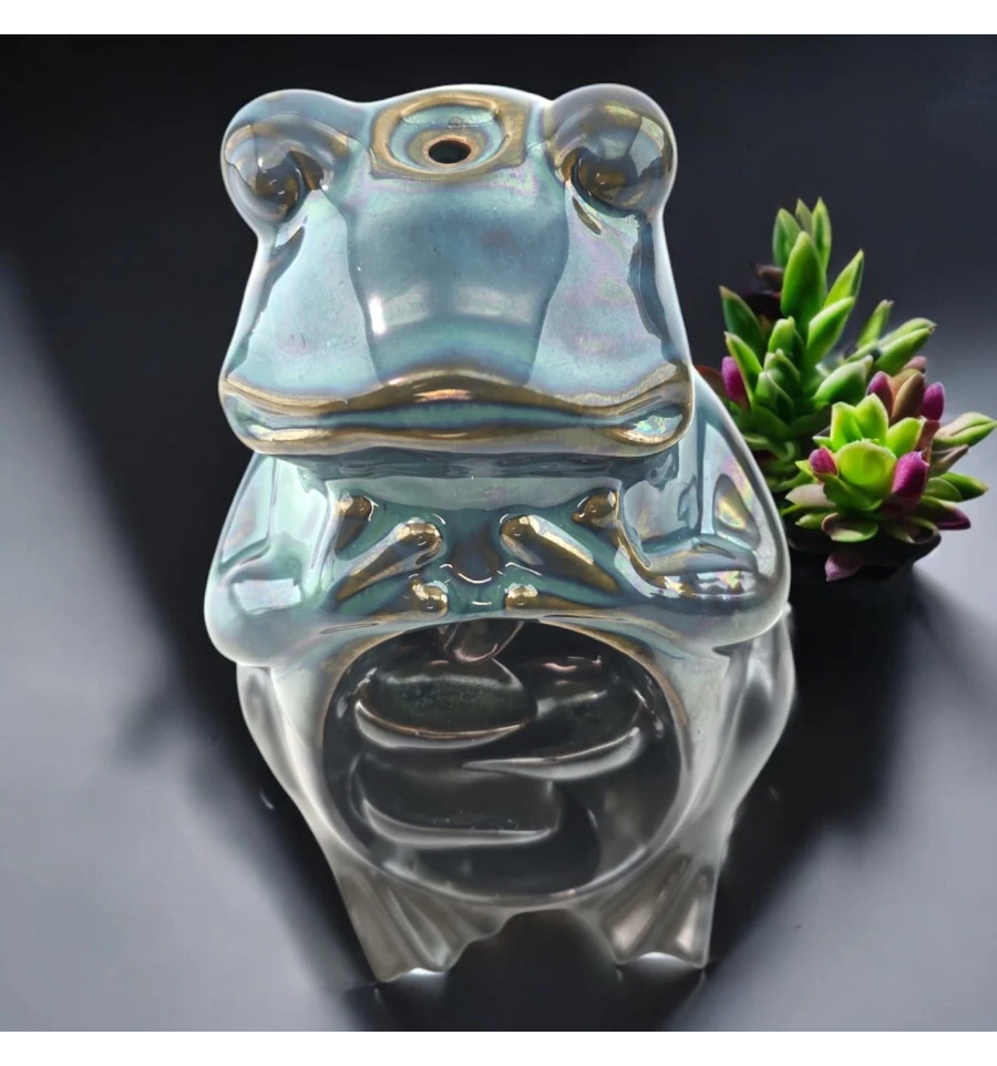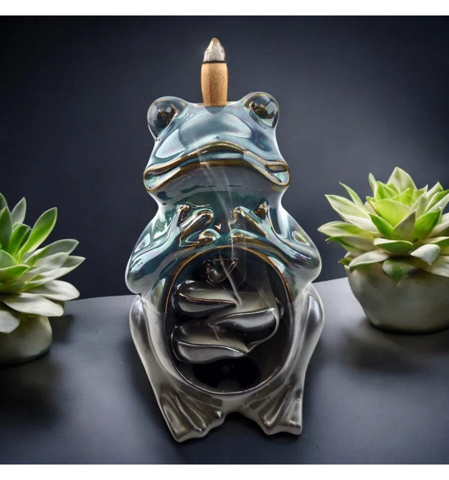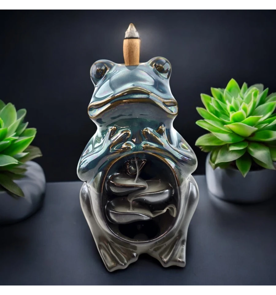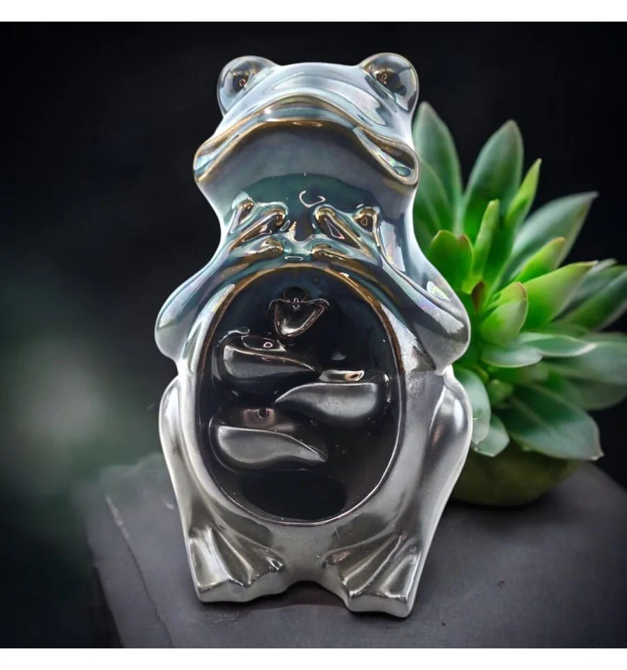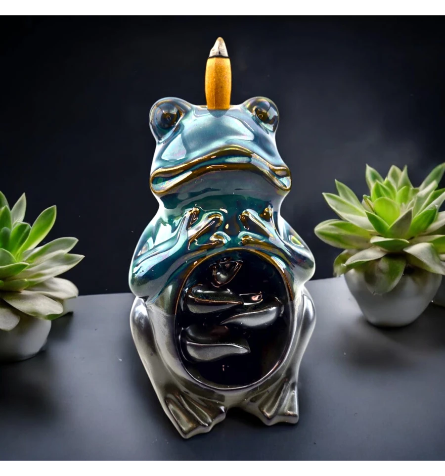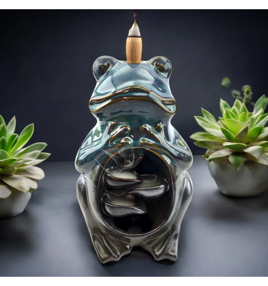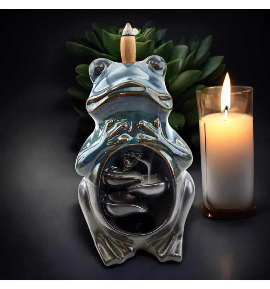 Опис: Ця підставка для пахощів Back Flow у формі жаби додасть вашому простору атмосферу спокою та гармонії. При горінні пахощів дим плавно стікає вниз, створюючи ефект "зворотного потоку", що нагадує медитацію та сприяє розслабленню.