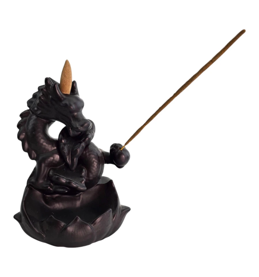 Керамічний тримач для пахощів у вигляді східного дракона в чаші-лотосі. Сумісний з двома форматами: конусами backflow (дим стікає вниз каналом в «чашу») і класичними паличками - для них передбачено окремий отвір на боковій кульці. Зручний для дому, студії йоги, медитації та як декоративний акцент. Для ефекту водоспаду використовуйте конуси backflow у приміщенні без протягів.