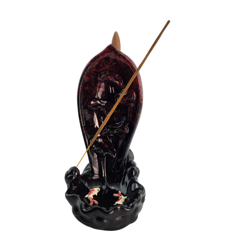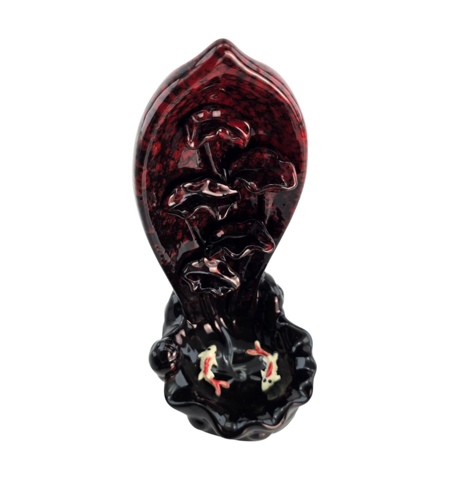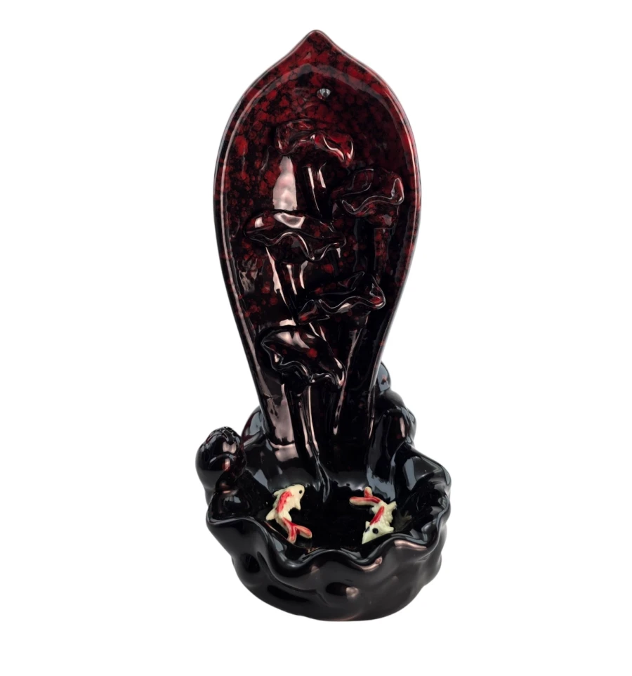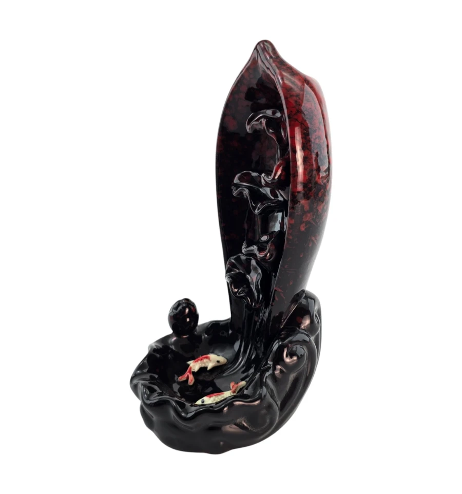 Керамічна підставка для пахощів у вигляді мініатюрного водоспаду з коропами коі. Темна глазур із червоними вкрапленнями створює ефект глибини, а в чаші внизу розташовані дві рибки, що ніби плавають у ставку. Така підставка додає інтер'єру атмосферу спокою, що добре підходить для домашнього куточка відпочинку, кабінету або зони медитації.