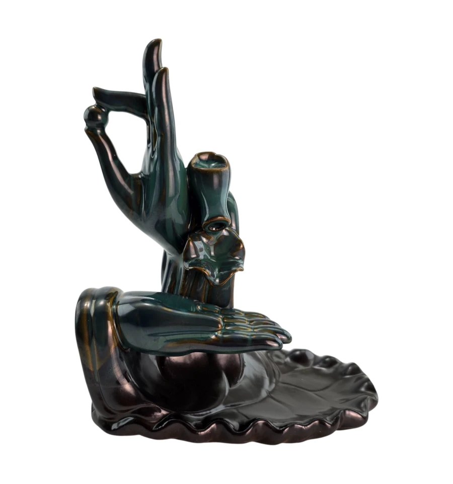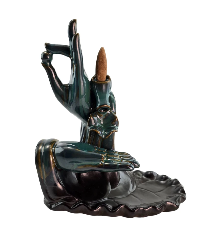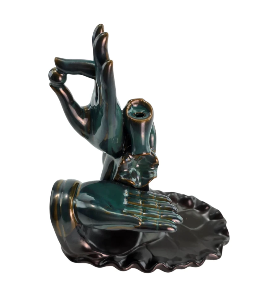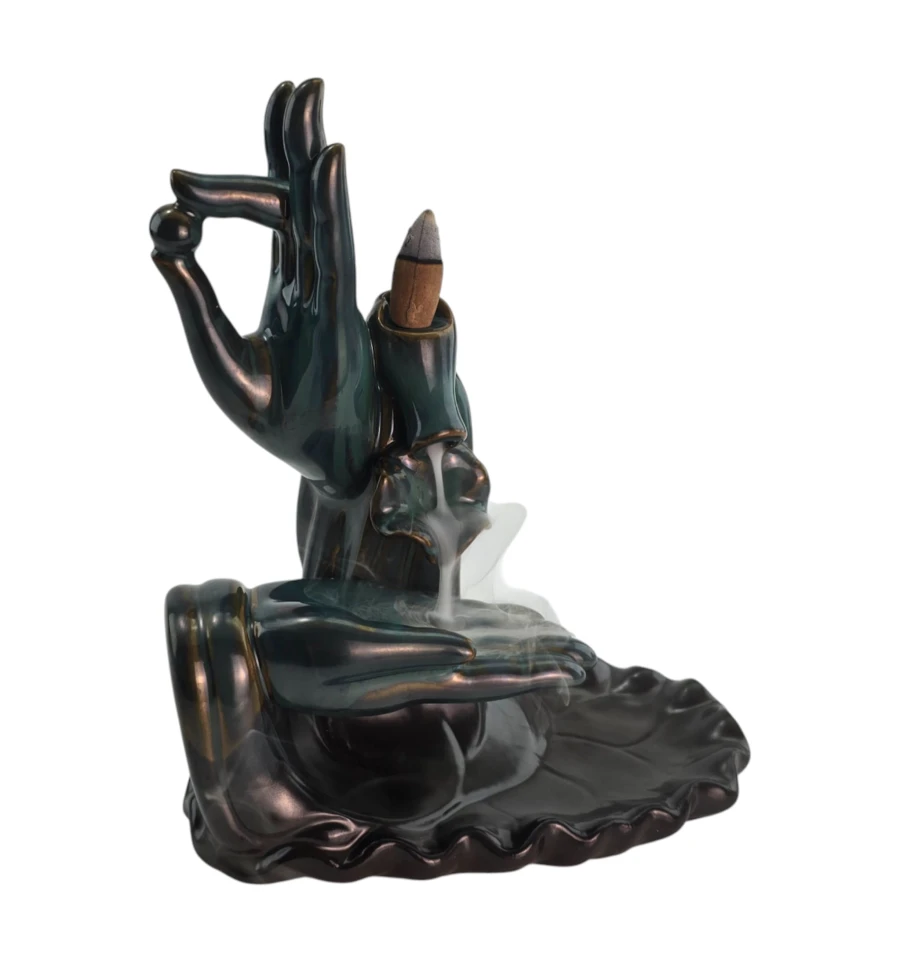 Естетична керамічна підставка у вигляді долоні з білим лотосом та квіткою зверху. Підходить для паличок і конусів пахощів: паличка встановлюється збоку, конус ставиться у верхню квітку. Форма спрямовує дим м'якими завитками та захищає поверхню від попелу. Підійде для домашнього вівтаря, куточку медитації, йога-студії або як приємний подарунок любителям аромотерапії. Можливі невеликі відмінності відтінків та фактури.