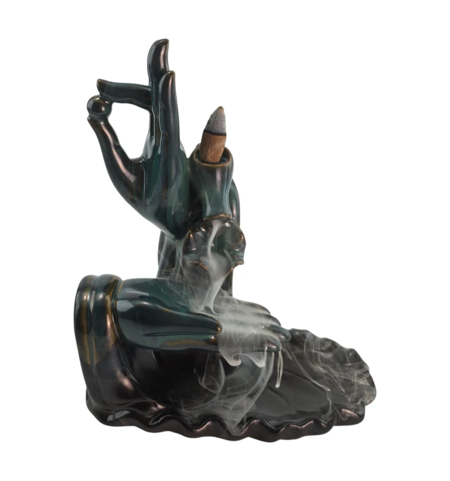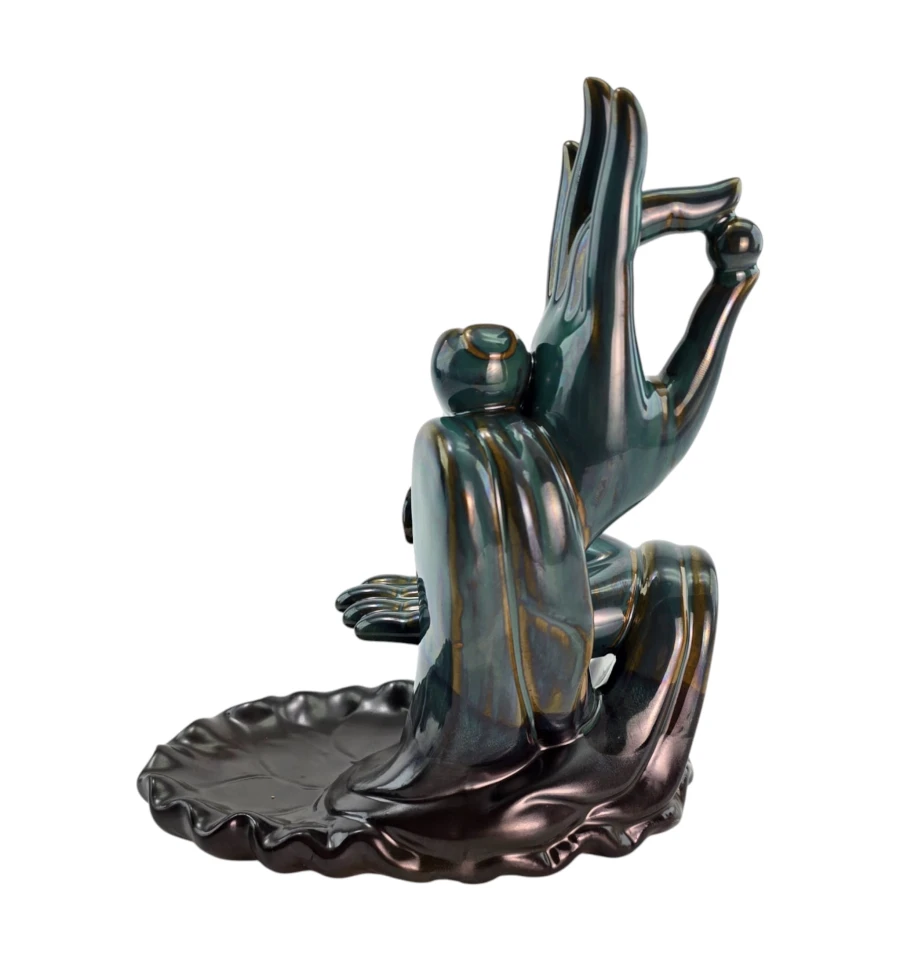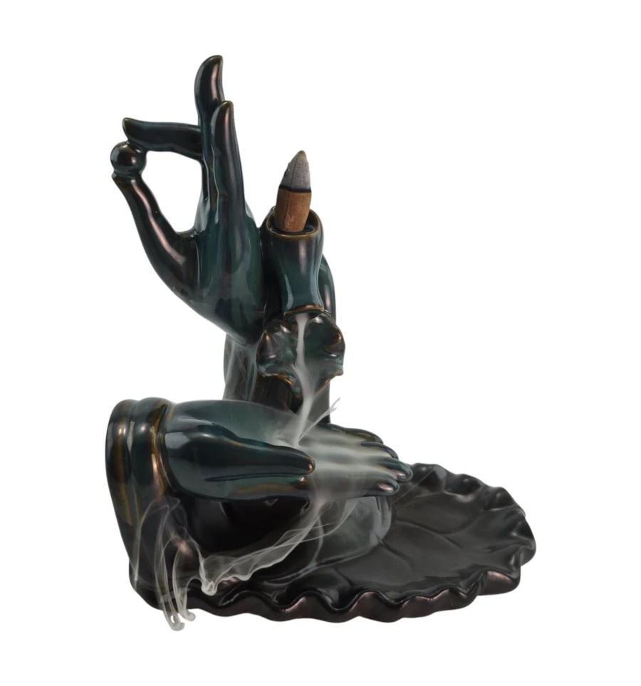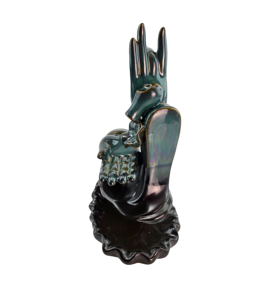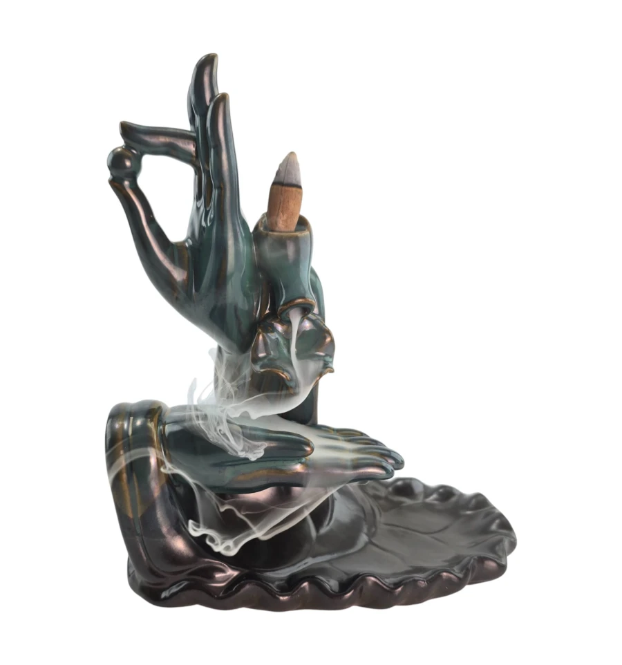 Естетична керамічна підставка у вигляді долоні з білим лотосом та квіткою зверху. Підходить для паличок і конусів пахощів: паличка встановлюється збоку, конус ставиться у верхню квітку. Форма спрямовує дим м'якими завитками та захищає поверхню від попелу. Підійде для домашнього вівтаря, куточку медитації, йога-студії або як приємний подарунок любителям аромотерапії. Можливі невеликі відмінності відтінків та фактури.