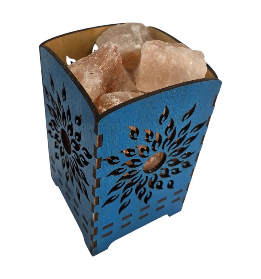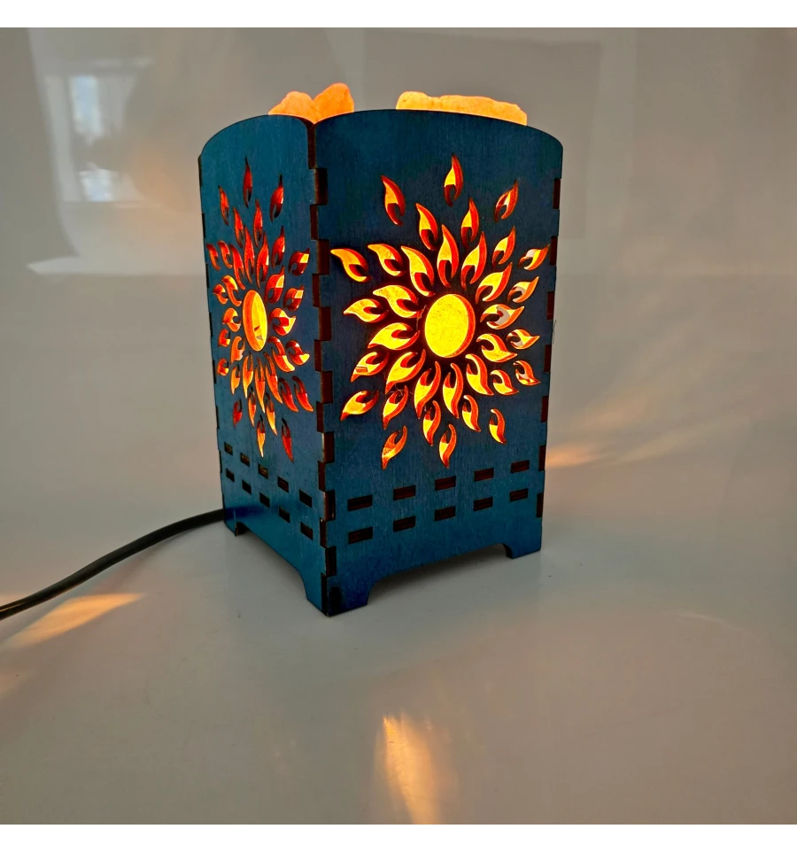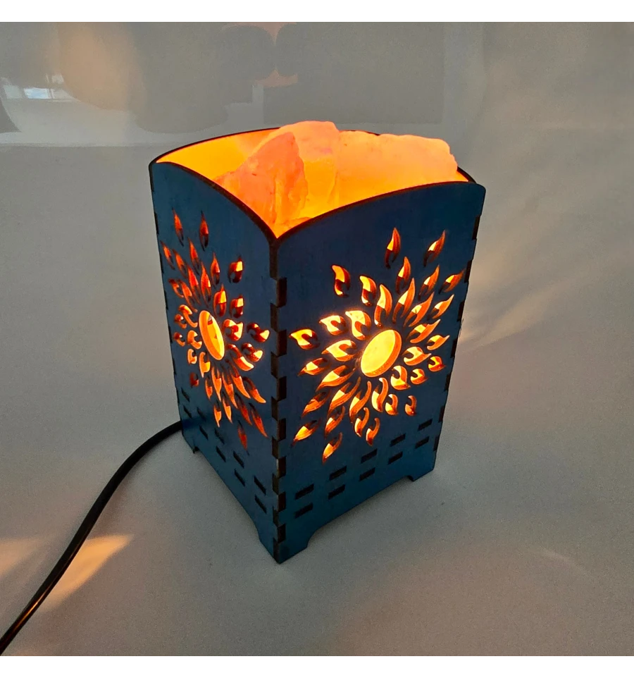 Корпус світильника виконаний з дерева з декоративним різьбленням у вигляді сонячного візерунка. При включенні лампи світло проходить через кристали гімалайської солі та різьблений орнамент, створюючи гарне сяйво та м'які світлові візерунки.