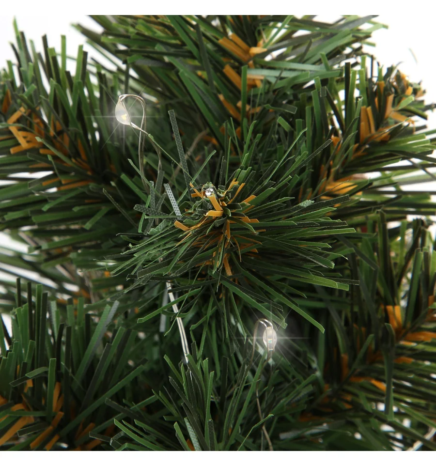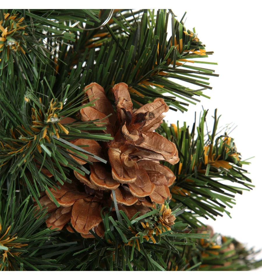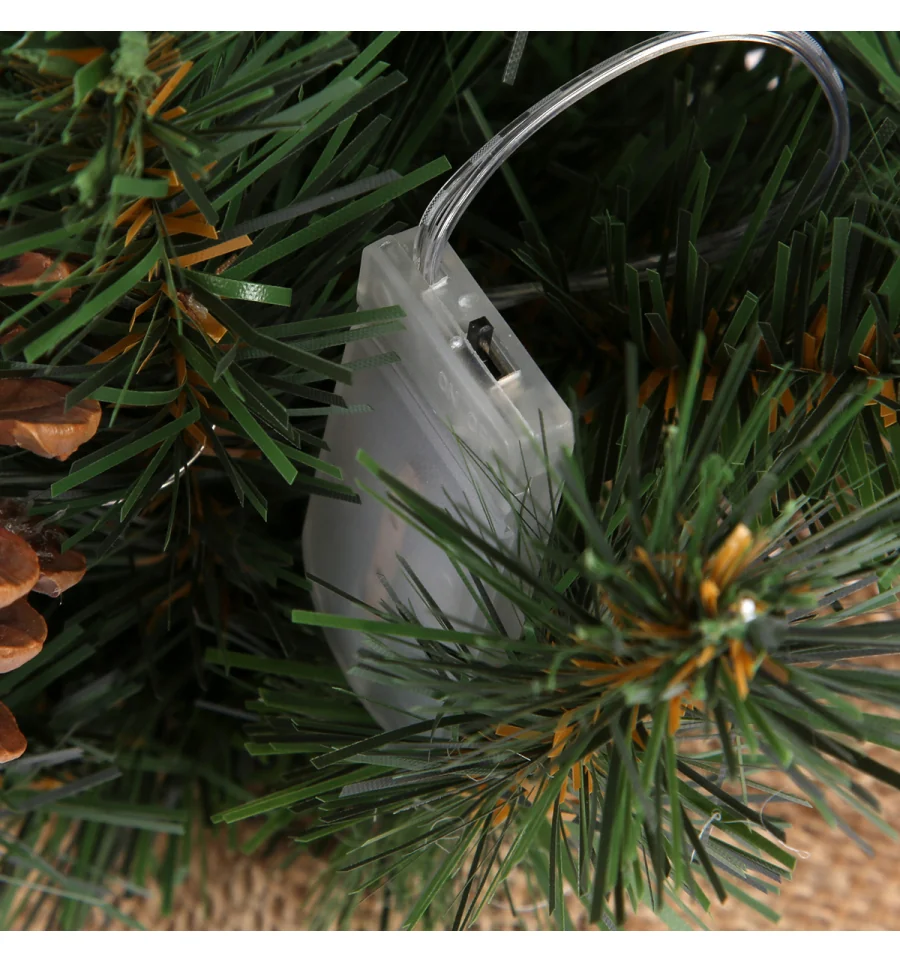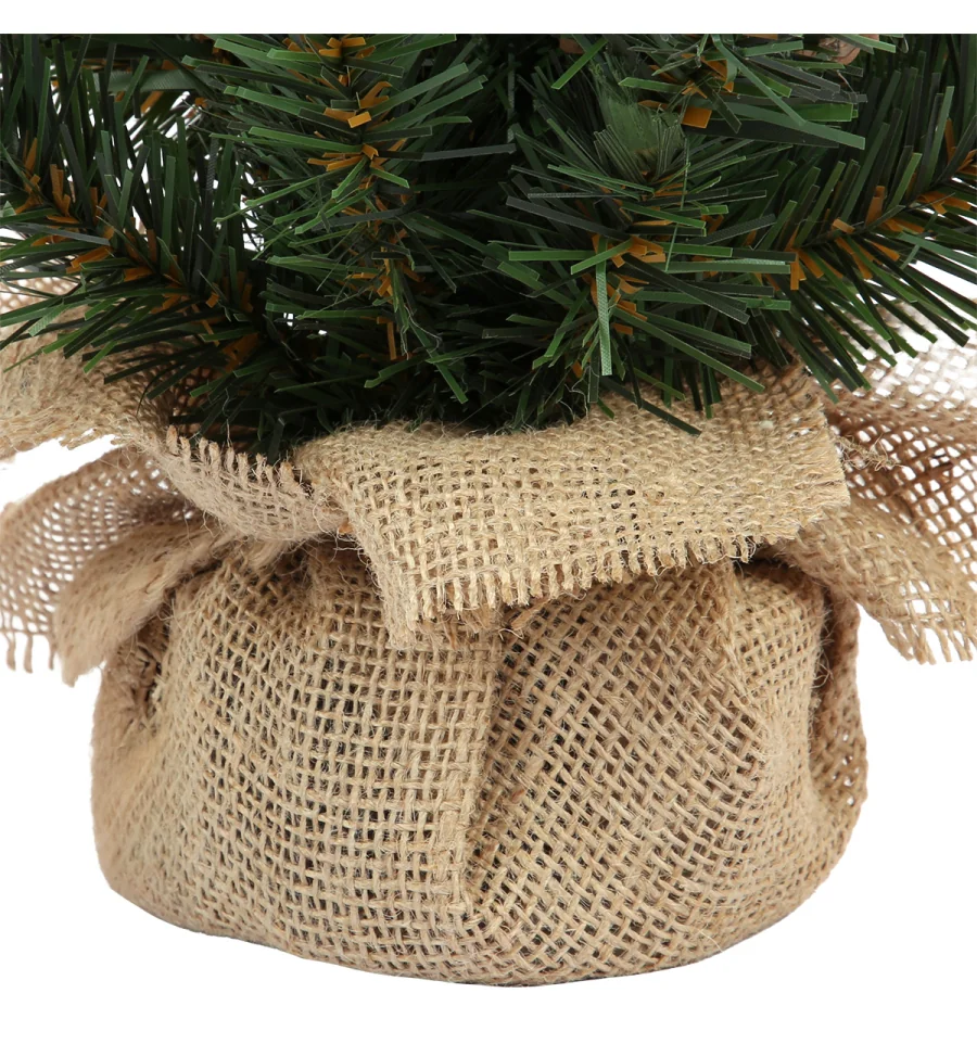 Штучна хвойна композиція виконана з якісної ПВХ-плівки та встановлена на стійку дерев‘яну основу, обгорнуту в мішковину. Вбудована LED-гірлянда додає теплого свічення, створюючи святковий настрій.