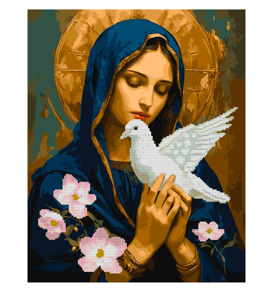 Картина за номерами з алмазною мозаїкою ТМ SANTI Мир у долонях — це ніжний образ жінки, яка дбайливо тримає білого голуба як символ миру, надії та чистоти. Спокійний вираз обличчя, м’які лінії та глибокі відтінки створюють відчуття умиротворення й душевного тепла. Золотисте сяйво підсилює духовний символізм, а сяйливі квіти додають композиції легкості та живої енергії природи.