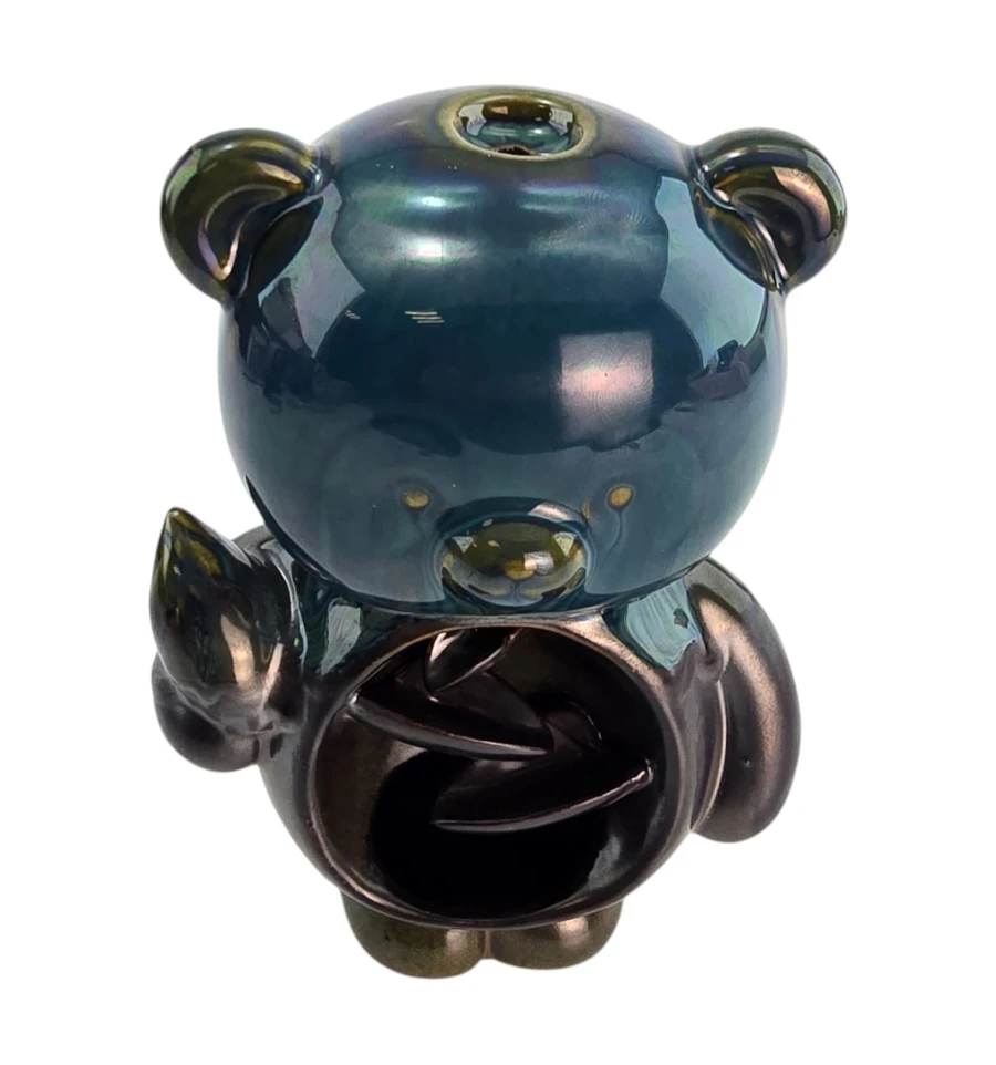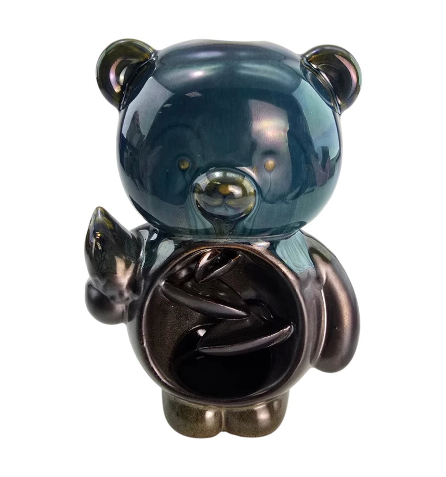 Підставка виконана з кераміки з гарним іризовим (перламутровим) покриттям у глибоких синьо-чорних тонах із бронзово-зеленими відливами. Ведмедик має підняту лапку, милу мордочку і круглий отвір внизу для стікання диму.